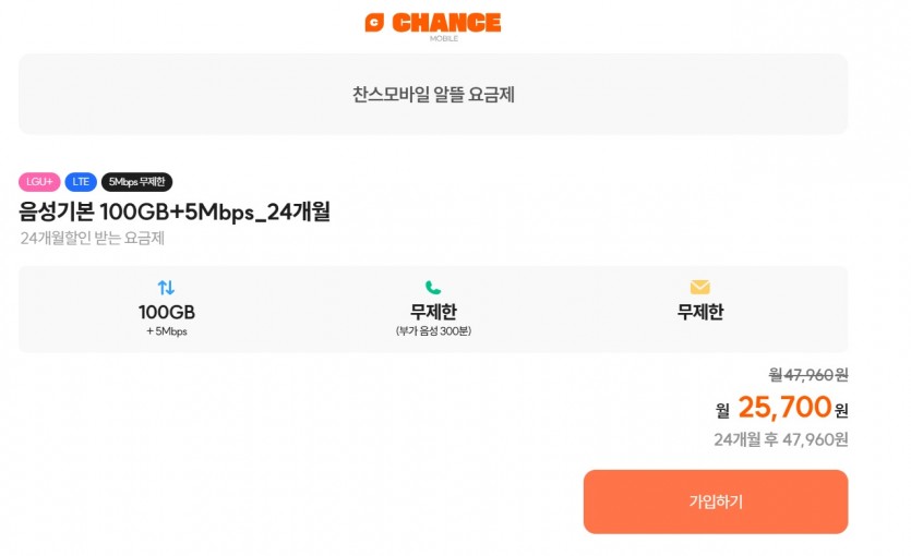 [찬스모바일]LG망 알뜰폰 100GB+5Mbps 24개월 통문무 (25,700원) (무료배송)